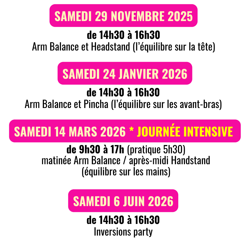 à réserver ensemble ou séparément Tarifs : 38€ / Atelier 2h 80€ / Journée Intensive 175€ / 4 dates réservées simultanément Places limitées - Atelier maintenu à partir de 3 participants.